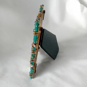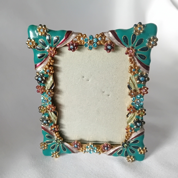 Elegant picture frame with teal and gold floral enamel design. Accented with red and blue details rhinestones.