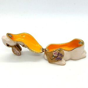 EUC with no signs of chips, cracks, scratches or crazing. Approx. size: 2.75" (w) x 1.75" (l) x 2" (h). This lovely rabbit trinket box is elegantly designed and is hand painted with crystal bling accents that sparkle, including the eyes. Inside the box, it is perfectly hand painted in yellow and the beautiful raised purple butterfly and rose flowers enhances the trinket box to give it a wonderful vintage look.