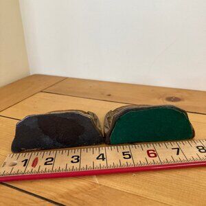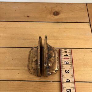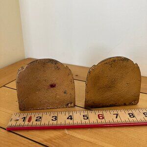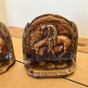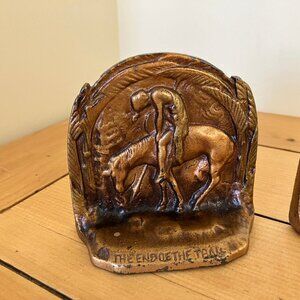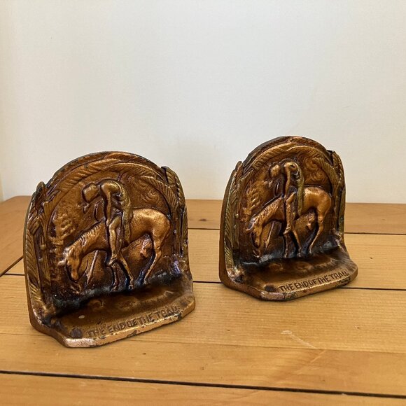 Vintage cast iron bookend set has embossed design of a warrior on horseback with text along the bottom edge that reads "The End of the Trail". Approx. 3 3/4" tall x 4" long x 1 5/8" across widest part of base. Set of 2 weighs approx. 1kg (2.2 lbs). Pre-owned vintage condition: metal has surface marks from display & use, some of the gold-tone paint is rubbed away in a few spots. One bookend has green felt on the bottom.