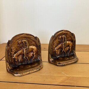 End of the Trail Embossed Cast Iron Bookends Set Vintage Gold-Tone Western Horse