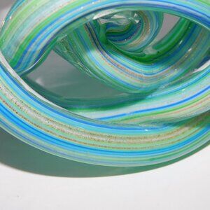 This beautiful Endless Knot Blown Glass Paperweight Home Desk Decor Sculpture Contemporary Abstract in Green Blue Aqua and Glitter Gold is in great clean condition free of chips, cracks ect. Measures approximately 4" tall and 5" Wide.