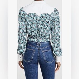 A polished statement piece with vintage flair. This Endless Rose blouse features an allover navy floral print with standout contrast detailing. The pointed white collar and white French cuffs add a crisp, tailored touch, while the gathered puff sleeves and darted bodice create a flattering, feminine silhouette. Finished with a unique western-style back yoke in ivory for an unexpected twist.