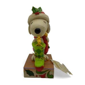 This charming Jim Shore figurine captures the whimsical spirit of Peanuts with Snoopy and Woodstock celebrating the holiday season.