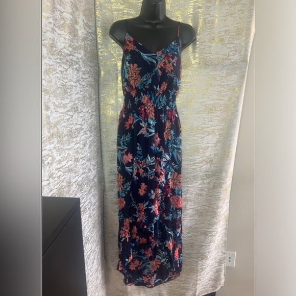 Smocked, cinched waist,High-low,Ruffle Front hem,floral print,Non adjustable spaghetti straps,Pull over the head dress, The liner has lots of stretch ,The outer material is not as stretchy and its sheer. elastic waistband, light material, high low skirt