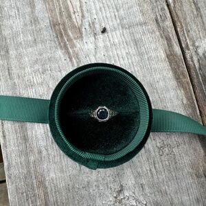 Size 5 1/2 approx . Sapphire almost looks like a black diamond in certain light settings, beautiful and unique. Ring has flower designs and filigree going up both shoulders. Truly one of a kind. Not my engagement ring, bought as a right hand ring.