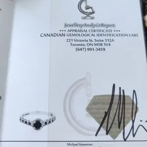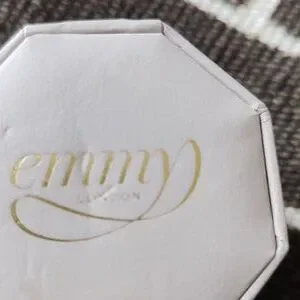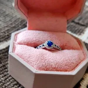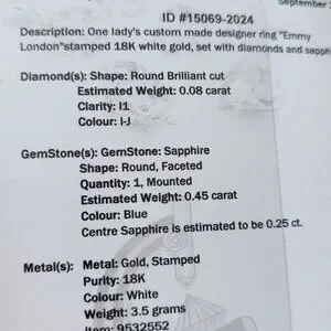 custom made designer ring Emmy London stamped 18k white gold with diamond and sapphires