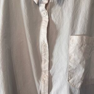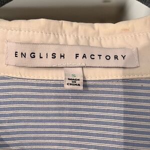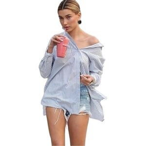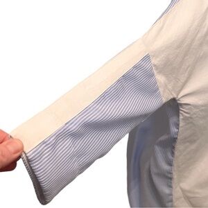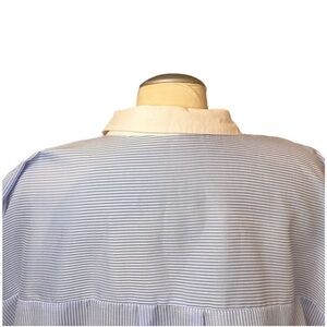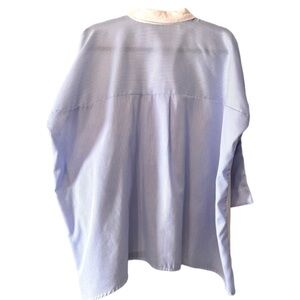 Oversized Anthropologie English Factory cotton shirt is white on the front and blue pin-striped on the back and arms. While the body is oversized, the arms are slim fitting. Shirt has collar and buttons up a quarter of the way. Asymmetrical hem. High quality.