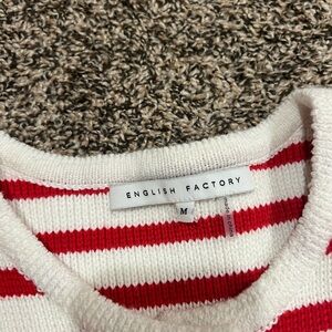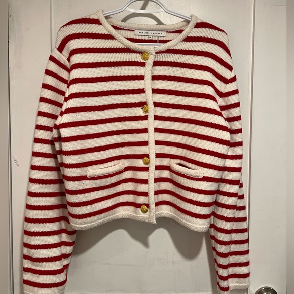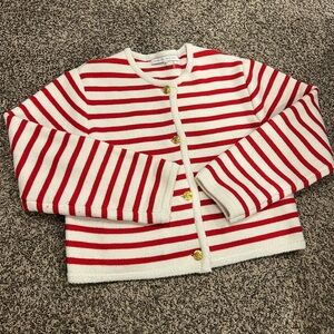 Striped knit cardigan with red and cream bands. Gold buttons down the front. Front patch pockets. Boxy silhouette. Worn a handful of times only
