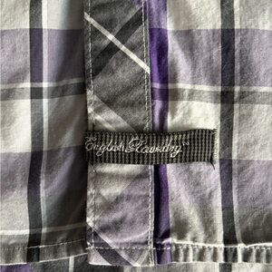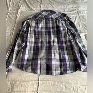 • Signature purple, grey, and black plaid with contrast floral trim inside the collar