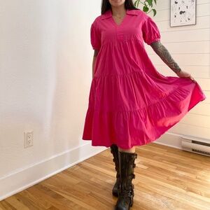 The most flattering dress in your wardrobe awaits. With a V-neckline and puff sleeves, this short midi dress is as comfortable as it is timeless. The perfect blend of femininity and functionality, this piece also features pockets and is lined for added structure. Whether you're dressing it up for a special occasion or keeping it casual for a day out, this is a must-have in your closet.
