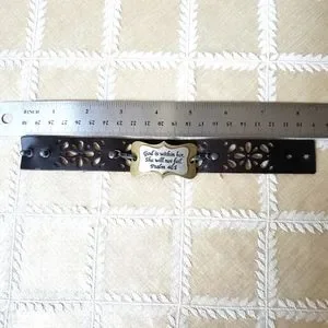 Engraved bracelet with lace leather strap. Ranges in size from 7 to 8 inches. New.