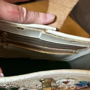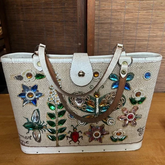 This chic vintage handbag features vibrant jewelled embellishments on a cream background.