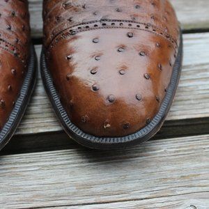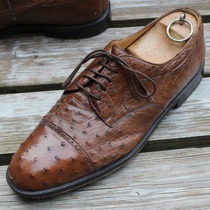"Enrico" brand ostrich leather derby. Hand made in Spain. Men's size 9 M. Full ostrich, in pristine condition with no major damage, other than a nick to the left toe.