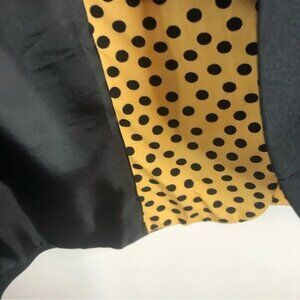 Black blazer with yellow/marigold polka dot trim and buttons. Faux pockets. Lined