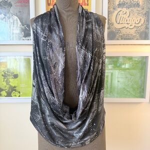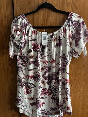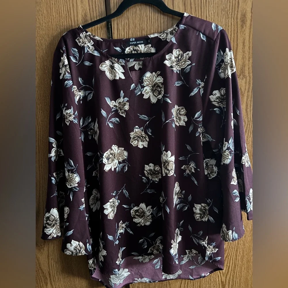 Chic floral blouse with a dark purple base. Features elegant floral patterns. Ideal for casual or dressy occasions.