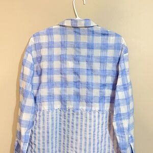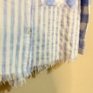 Entro Blue & White Contrasting Pattern Cotton Button Up w Frayed Hem