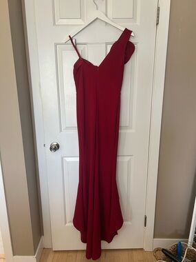 Sleek one-shoulder maxi with a sculpted sweetheart bodice. Features a dramatic rosette at the shoulder and cascading ruffle detail down the skirt. Slim through the hips with a flared hem for movement. Bold red color ideal for formal occasions. Purchased in a little boutique in downtown Vancouver called Artemesia.