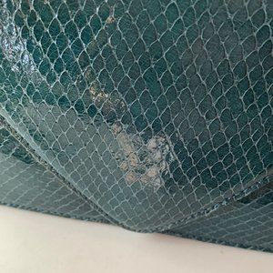 Green snakeskin print patent leather envelope clutch with front snap enclosure & interior pocket.