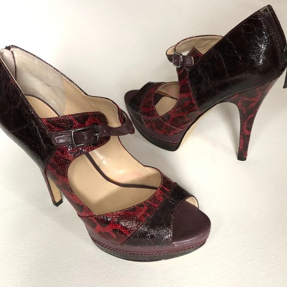 Enzo Angiolini snakeskin print and burgundy leather platform pumps.