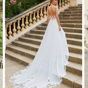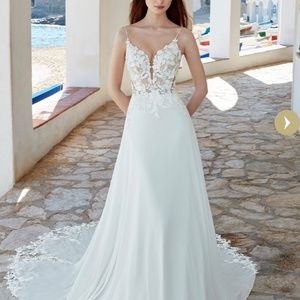 Brand new dress, never worn and completely unaltered! The Amina gown by Enzoani is truly stunning —light, flowy, and so flattering. It’s an A-line/sheath silhouette with a beautiful lace train.