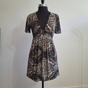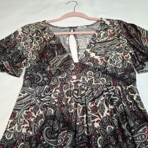 Eoote Grey Pailsley Empire Fit n Flare Mini Dress Size M Stretch Flutter Sleeves Deep V Keyhole Back