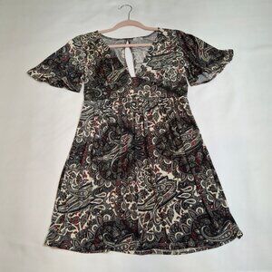 Eoote Grey Pailsley Empire Fit n Flare Mini Dress Size M Stretch Flutter Sleeves