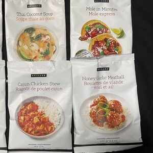 Enjoy this bundle of Eight Epicure meals, includes Huevos Rancheros, Hearty Beef Stew, Aloo Gobi, One Pot Pasta, Thai Coconut Soup, Mole in Minutes, Cajun Chicken Stew & Honey Garlic Meatballs. All gluten free and perfect for making quick and delicious meals.