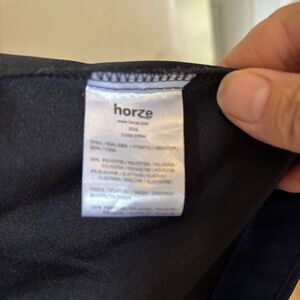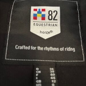 82 Horze Equestrian dark blue coat with black lining in polyester for weather resistance and movability while riding or any other activity. Details include zipper front that is covered on the inside to block out wind, toggles at neck and both sides of waist, zippered pockets at sides and hidden inner pockets as well. Has Horze logo on bottom of right sleeve, curved back hem for riding ease. Coat has a 38 inch chest, 40 inches pit to pit, 24 inches in front and 26 inches long in the back. Condition is used, like new, clean with no issues.