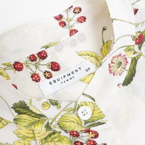 Elegant and timeless, this Equipment Femme silk blouse features a beautiful botanical floral print with berries, leaves, and blossoms on a crisp white background. Made from 100% silk, it drapes effortlessly with a luxurious, lightweight feel. Designed with a band collar, button front, and long sleeves with button cuffs for a refined look. Perfect for both office wear and casual chic styling.