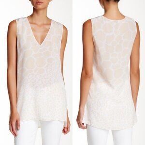 Equipment Otis Silk Sleeveless Tunic Top in Nude and Women’s Size Medium. A monochromatic mix of giraffe, leopard and cheetah print style a v-neck crepe de chine top with split sides and a hi-low hem. V-neck. Sleeveless. Approx 28.5 front length and 29.5” back length. 100% silk. Dry clean. Very good pre-loved condition. No flaws.