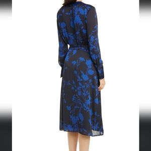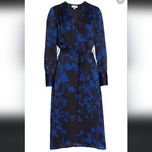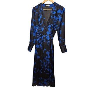 Tags: blue floral wrap dress, long-sleeve midi dress, elegant party dress, flattering tie-waist dress, black and blue floral dress, cocktail, formal, office, work, weekend