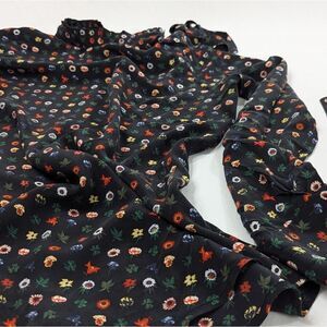 Multi color floral polka dot silk crepe de chine with dark slate background. Mock neck & sleeve cuffs have wrap tie closures. Yes, you can actually tie them by yourself.