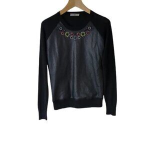 This is a black embellished top with a leather front and knit sleeves and back by designer brand Erdem.