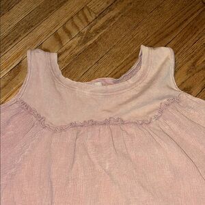 Add a chic touch to your wardrobe with this ruffled tank top. The blush hue offers a soft, feminine look perfect for any occasion. 100% cotton. It has a few lighter spots on the front, but it is not too noticeable since the whole thing is sort of a soft blended, muted colour. See pics for details