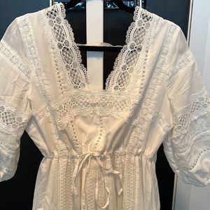 Eri + ali from Anthropologie - white mini/midi dress with lace details - small. Self tie waist. Fits more like a medium. Small makeup stain on sleeve (see photo)
