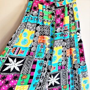 Beautiful Eric Ryan Sport vintage button front high waisted skirt in excellent condition with vibrant colors of blue, yellow, pink, black, white and green. Picture shows blue but it's more like a teal color. Marked as size 8 vintage. Would fit modern Small or Medium Please see measurements on the photos. Has elastic waistband on the back. Black shiny buttons on front. Made in Canada.