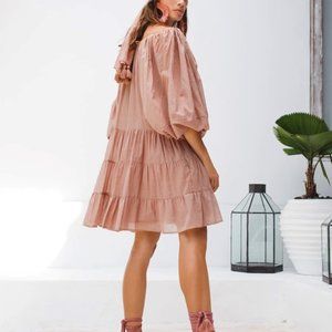 Off the shoulder short dress with elastic neckline and full billowy sleeves. This dress consumes 12 meters of hand-dyed cotton voile fabric and takes 15 hours of sewing time to create the voluminous effect of the multiple cascading tiers.