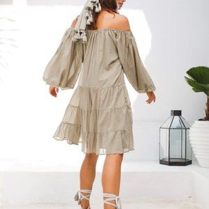 This piece is for carefree souls, a shoulder baring ensemble suited for beachside glamour. This beautifully voluminous knee-length dress can be worn alone or layered over your favourite bikini.
