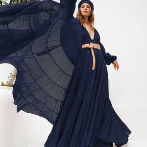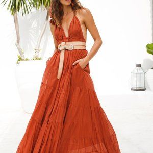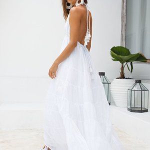 Halter bodice with braided straps finished with dangling tassels. Low adjustable back with braided straps and embellished with tassels. This dress consumes 12 meters of hand-dyed cotton voile fabric and takes 15 hours sewing time to create the voluminous effect of the multiple cascading tiers.