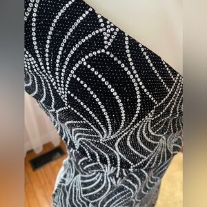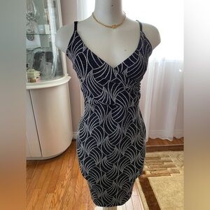 Be ready for the party season in this cute knee-length cocktail dress with adjustable straps, black/ white/silver pattern, sweeping neckline and lined bust. This piece is brand new without tags!