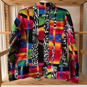 Bold patchwork design with vibrant colors. Features a mix of patterns for a unique look. Perfect for adding flair to any outfit.