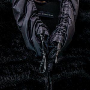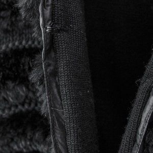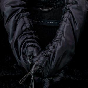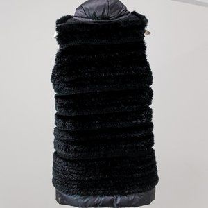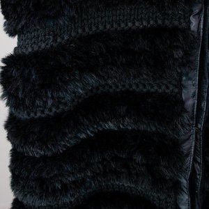 A luxurious classic vest from Italian fashion house Ermanno Scervino in black featuring a ribbed exterior with real rabbit fur trim and a thick knit, high collar with adjustable drawstring, inseam pockets, and hook-and-eye closures. This vest is filled with down and lined with a cozy knit fabric for you to be stylish and warm this winter.