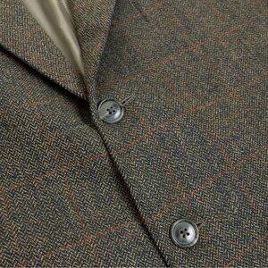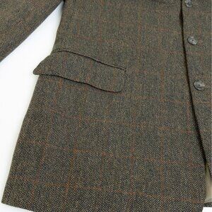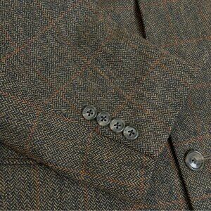 A soft herringbone weave in a rich brown tone with rust plaid overlay. Lightly padded shoulders, three - button front. No vent.
