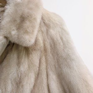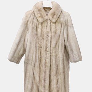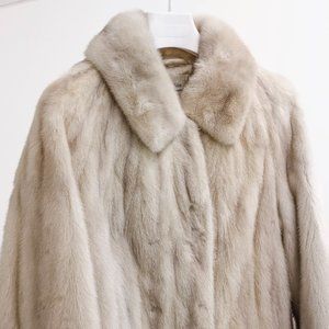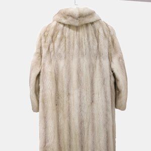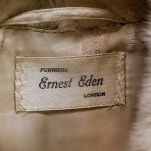 A gorgeous vintage grey mink coat from London-based furrier Ernst Eden featuring notched lapels, four front hook and eye closures, long sleeves, double jacket vents, and a fully-lined interior decorated with silver floral embroidery. The interior contains a small slip chest pocket and the name “Winifred” embroidered below.