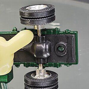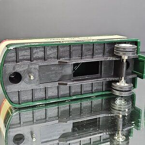 Missing bottom coin door and key. Axle has a small bend not noticeable unless you try to turn the wheel. Small marks as would be expected with a lightly used toy bank.