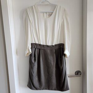 Elevate your wardrobe with this chic Eryn Brinié Collection colorblock dress. Featuring a two-tone design with an ivory blouse-style bodice and a taupe skirt, this dress exudes sophistication and modern elegance. The skirt portion is fully lined, ensuring a polished fit and added comfort. With thoughtful details like pleated accents and subtle pockets, this piece is as practical as it is stylish. Perfect for work, events, or an evening out, this versatile dress is both timeless and contemporary.