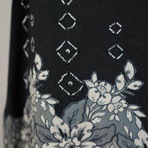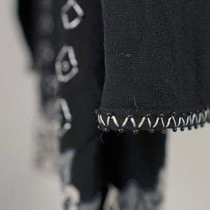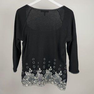This sweater from Escada is made in a black wool-blend knit, and features 3/4 sleeves, a square neckline, raglan shoulders, beading on the hems and on the bodice, and a white floral lace hem.