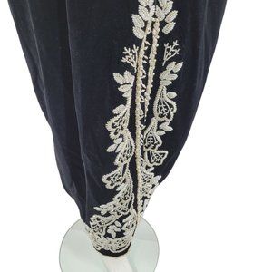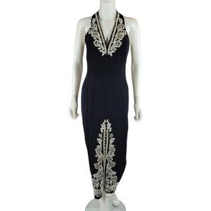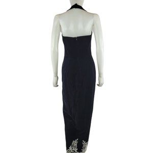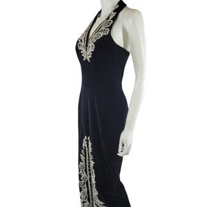 Escada by Margaretha Ley Black Vintage Velvet Long Formal Dress. Halter, backless with white beads, deep v neck with front slit. Made in Germany. 77% Cotton, 23% Rayon.