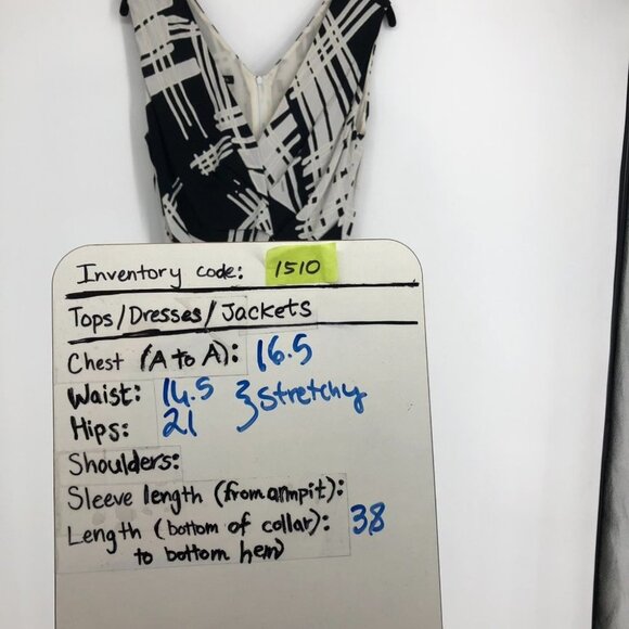 Elegant midi dress that's form fitting at the top and falls straight from the hips, has abstract black & white pattern printed; sleeveless with a v-neck and wide straps.