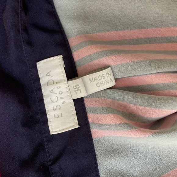 Escada striped Magenta/Blue blouse. Side vent. Gold tone button on collar and sleeves. In mint condition. Polyester but feels soft like silk. Colour is on trend for '23!